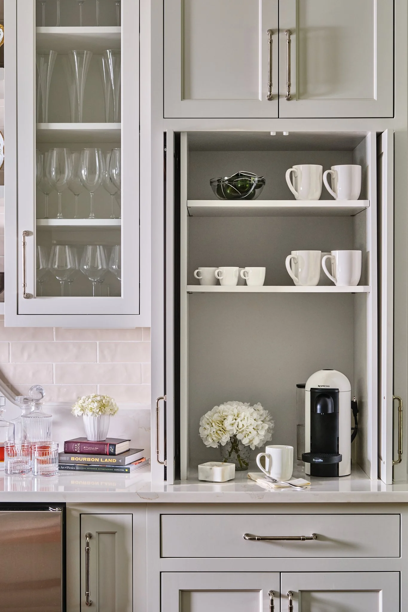 Quartz countertops and decorative backsplashes provide a timeless foundation, while polished nickel fixtures bring a quiet warmth and subtle shine to the space.
